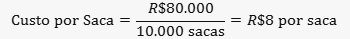 Este valor representa o custo total para produzir a safra em questão. A partir deste ponto, podemos calcular o custo por unidade de produção dividindo o CTP pela quantidade produzida. Se a fazenda produzir 10.000 sacas de milho, o custo por saca seria: